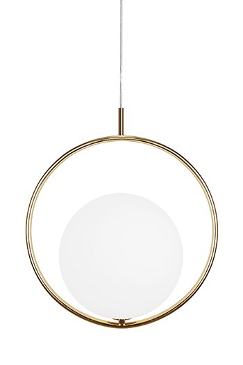 Taklampa "Saint" hade enkelhet som inspiration. Ringen i mässing med det svävande vita glasklotet inuti