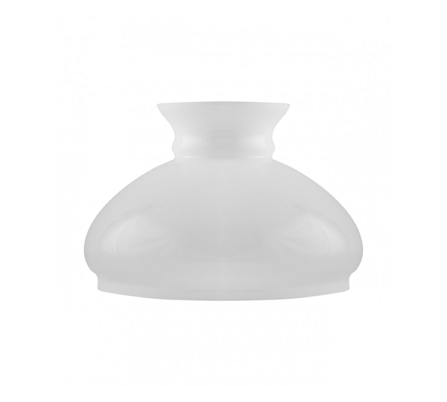Klassisk vestaskärm i munblåst vitt överfångsglas med mjukt välvd, kupolformad siluett. Formen ger ett behagligt och jämnt ljus och har varit ett återkommande inslag i traditionell belysning sedan slutet av 1800-talet.